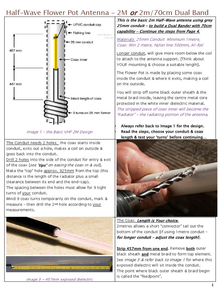 To construct the antenna first select a suitable length of grey 25mm conduit as a minimum 1m but if you make it longer you will have more room below the coil to attach to your antenna support. Half-Wave Flower Pot Antenna. The antenna is dual banded to operate on 70cm using the same sleeve technique as used on the dual-band basic Flower Pot.